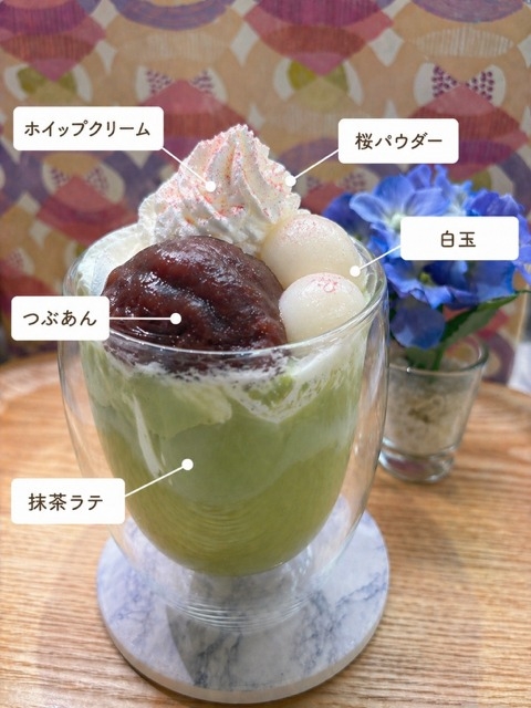 抹茶ラテにホイップクリーム、あんこ、白玉をトッピングした