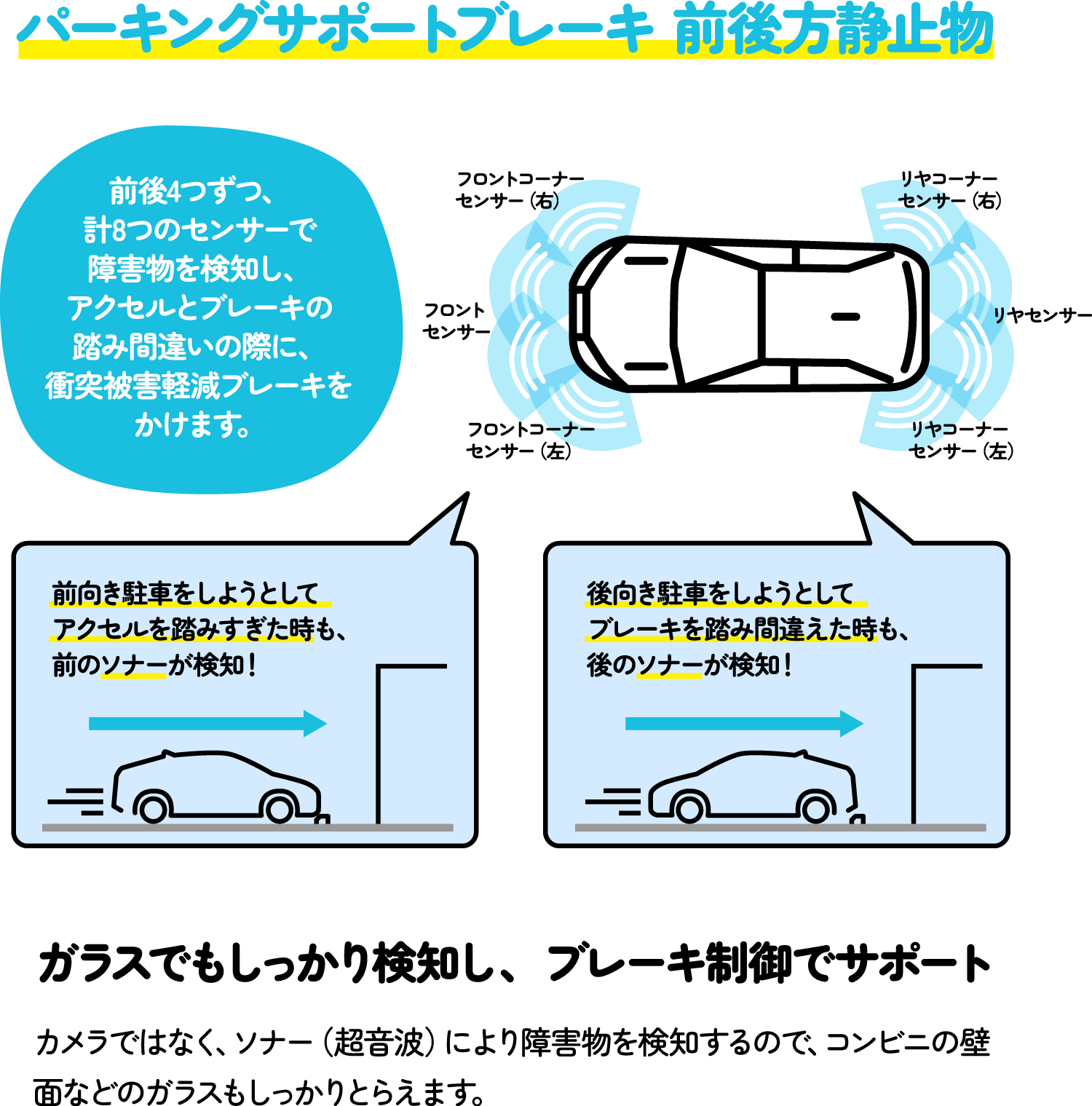※パーキングサポートブレーキ 前後方静止物は、あくまで運転を支援する機能です。道路状況、車両状況、天候状態および操作状態によっては、システムが正しく作動しないことがあります。システムを過信せず、必ずドライバーが責任を持って周囲の状況を把握し、安全運転を心がけてください。詳しくはWeb又は店頭で。