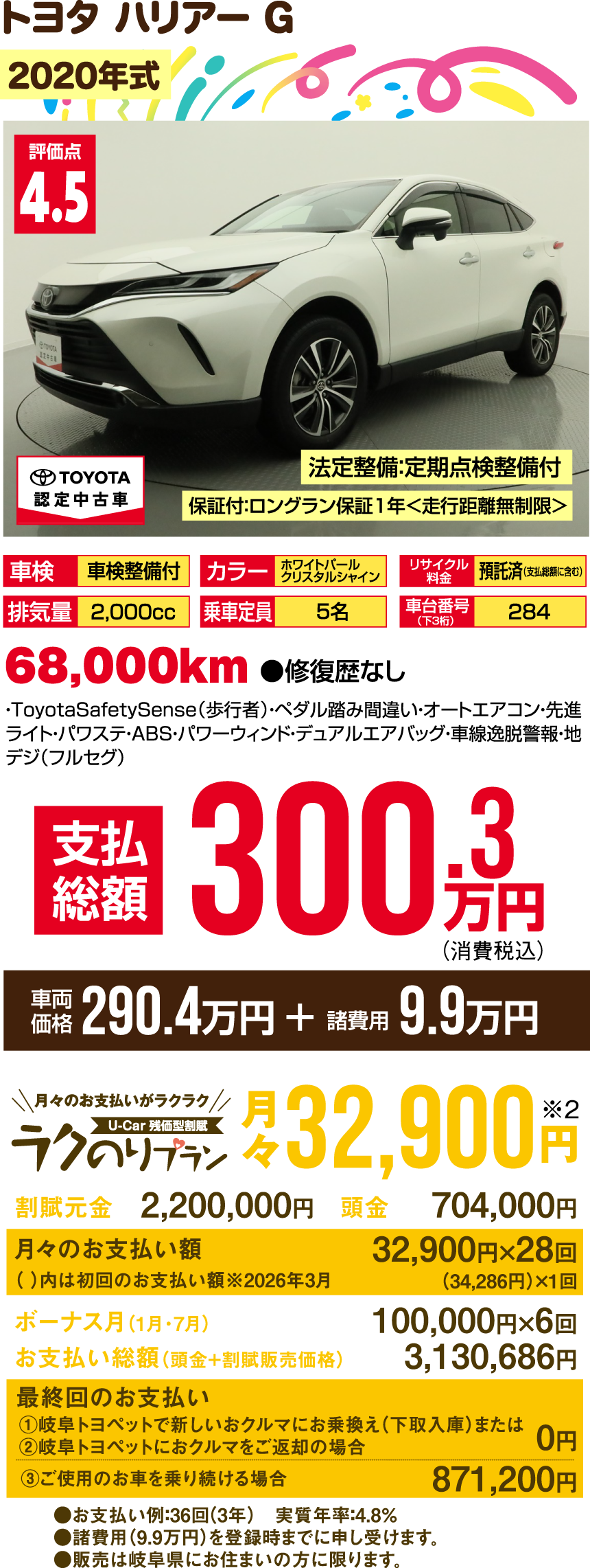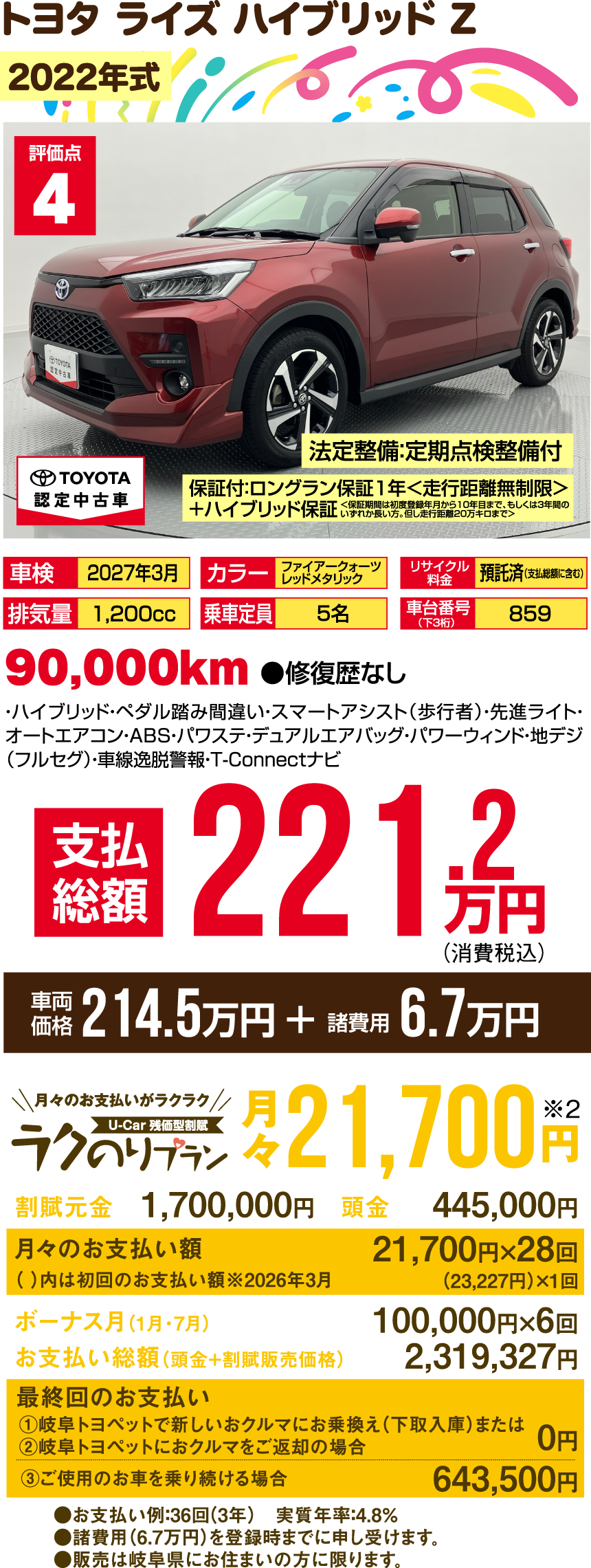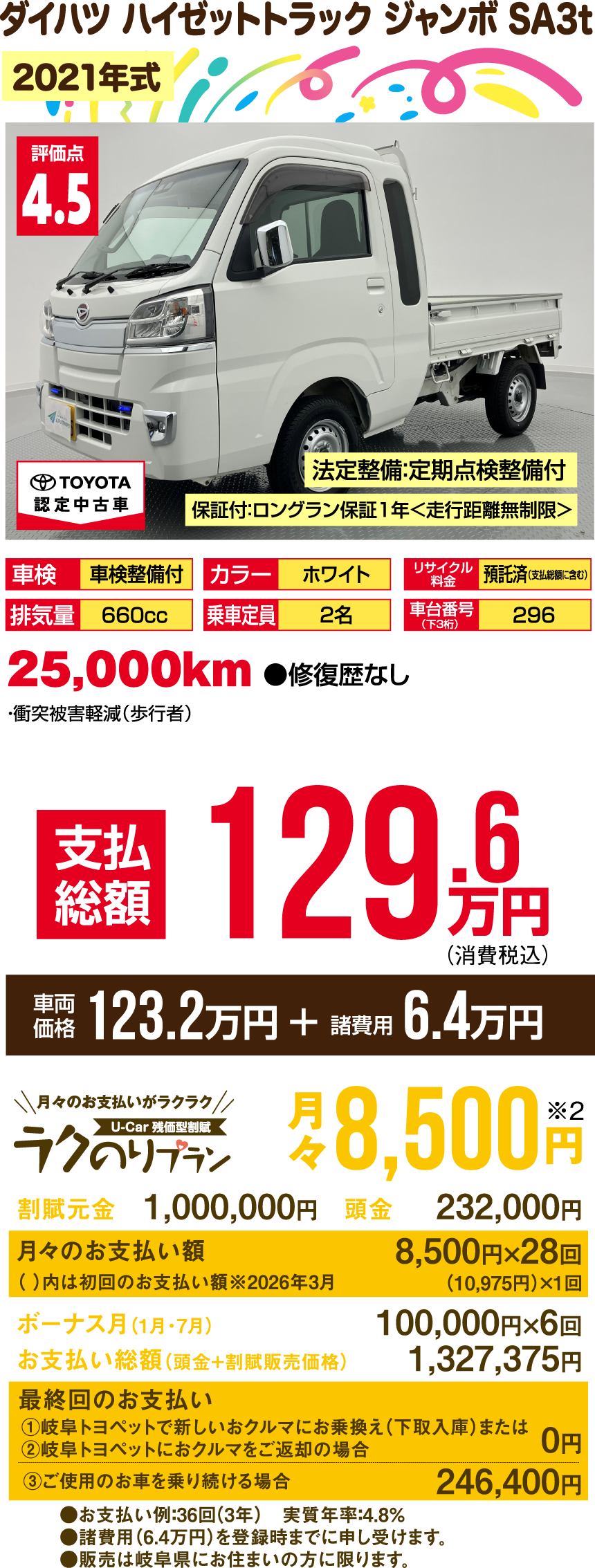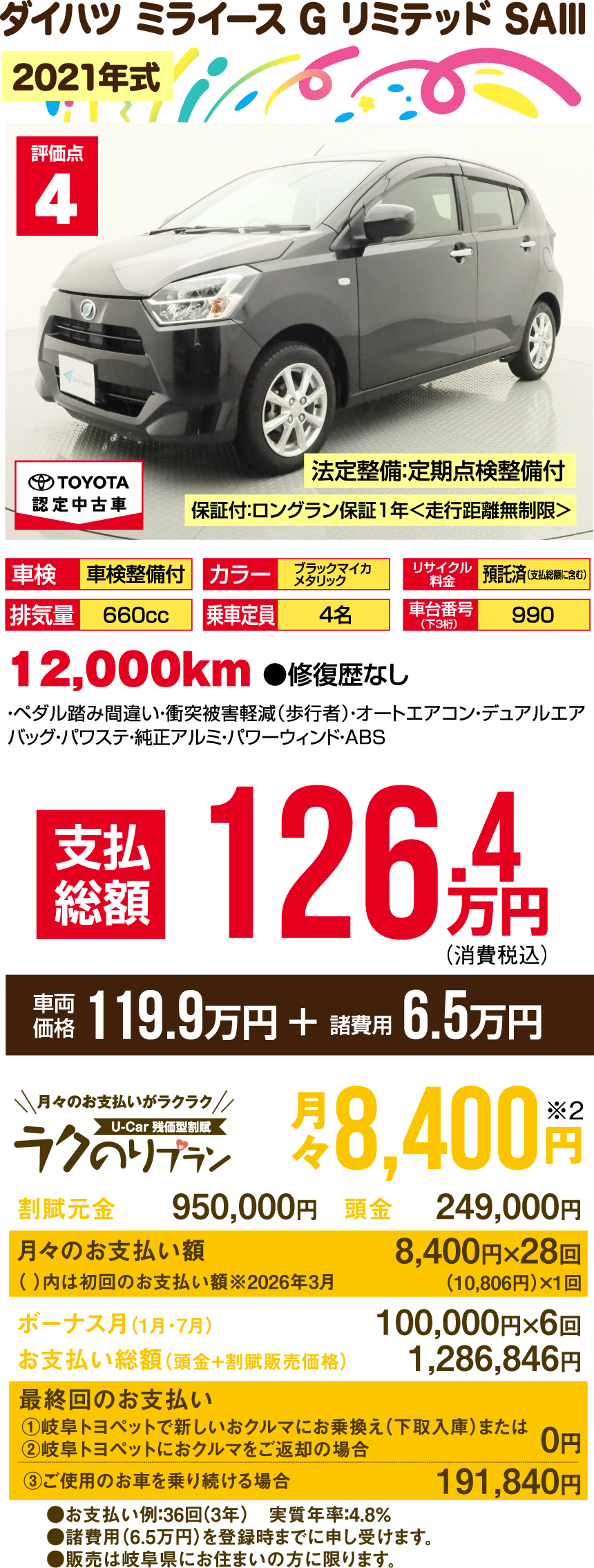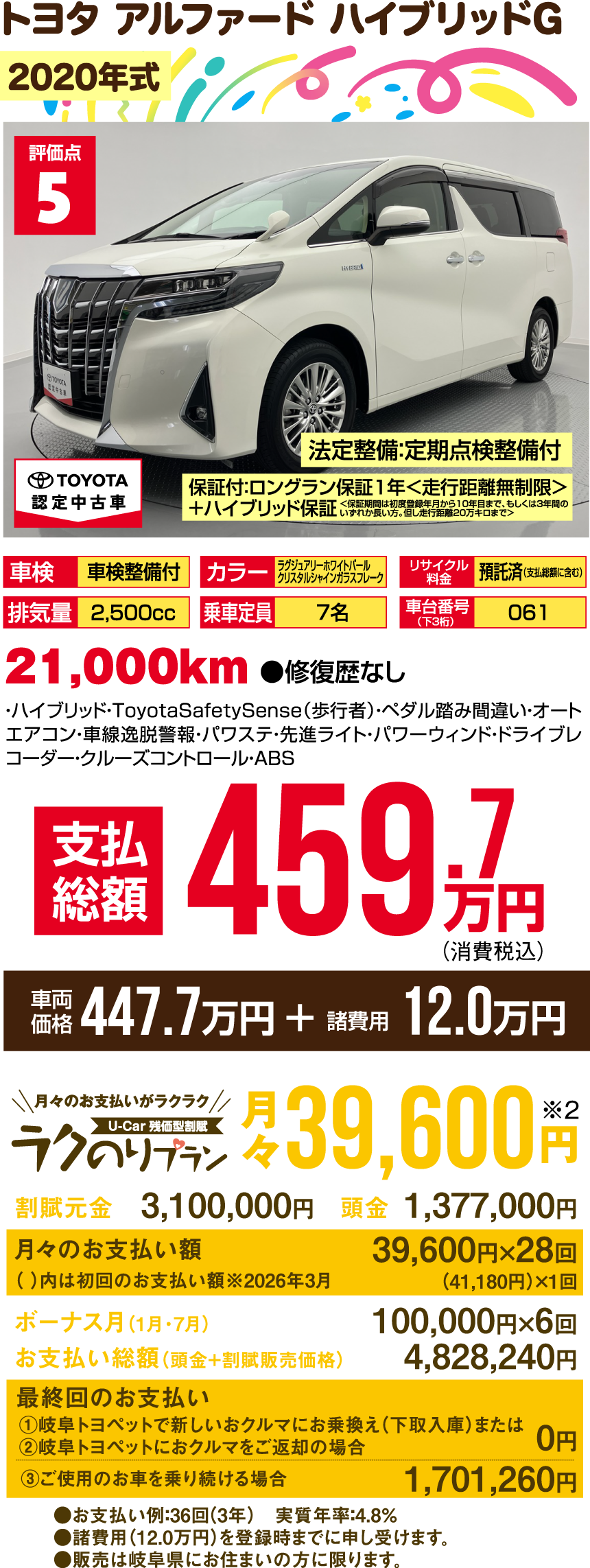 ※支払総額には、車両価格の他、保険料、税金、登録などに伴う費用など、購入の際に必要な全ての費用が含まれております。※「車検整備付」の場合、車検の有効期限が切れているため、納車時までに、乗用車は24ヵ月、商用車などは12ヵ月定期点検整備を実施し、車検を取得して納車します(費用は支払総額に含む)。※支払総額は、展示店にて2月登録の場合の価格です。お客様の要望に基づくオプション等の費用は別途申し受けます。※消費税10%込みとなります。※支払総額は、個人による購入で、下取車なし、店頭納車、販売店の所在する所轄運輸支局で登録する場合を前提としております。※車検切れ車両の場合、車検を取得するために必要な費用は、支払総額に含まれております。※ETCのセットアップ費用は別途申し受けます。※ウェルキャブ車(福祉車両)については、装置の種類や購入者の障害者手帳の有無、お住まいの都道府県の税制度により、税金の減免が異なる場合があります。◎3ケタの数字000…車台番号下3ケタを表示しています。※車両の正確な装備・価格は店頭の現車にてご確認ください。※慎重に作成しておりますが、万が一掲載ミスがあった場合はご容赦ください。※詳しい情報は、販売店へ直接お問合せください。掲載の車両は2026年1月7日時点の情報です。売約済みの際はご容赦ください。●販売は岐阜県にお住まいの方に限ります。