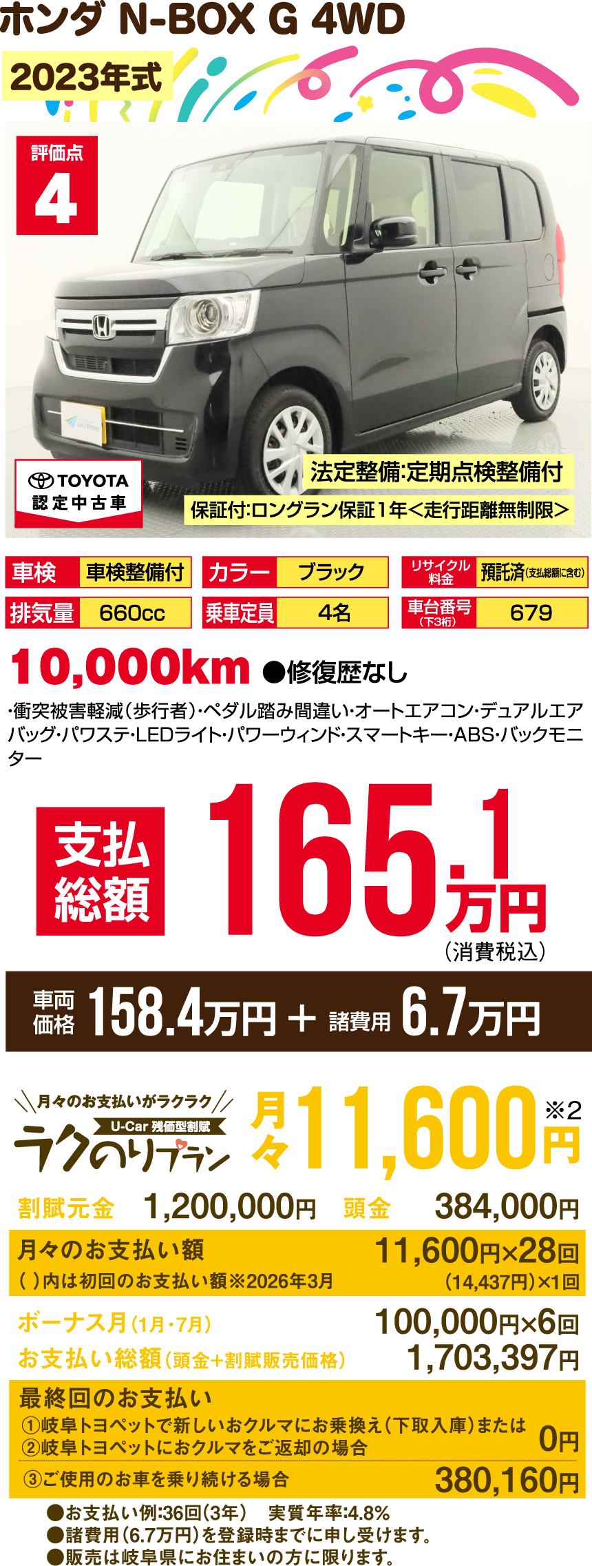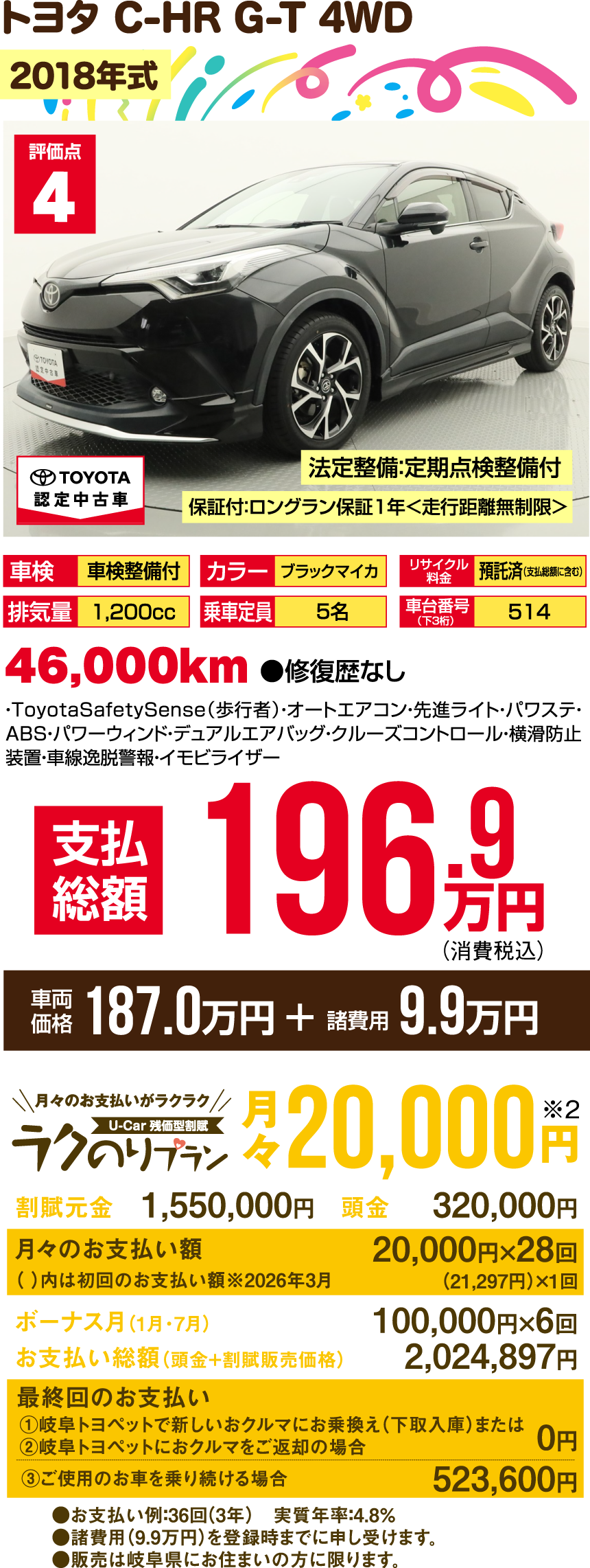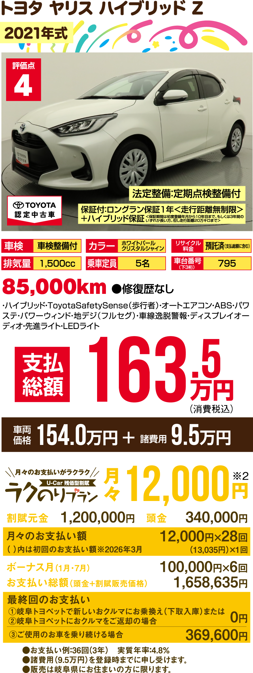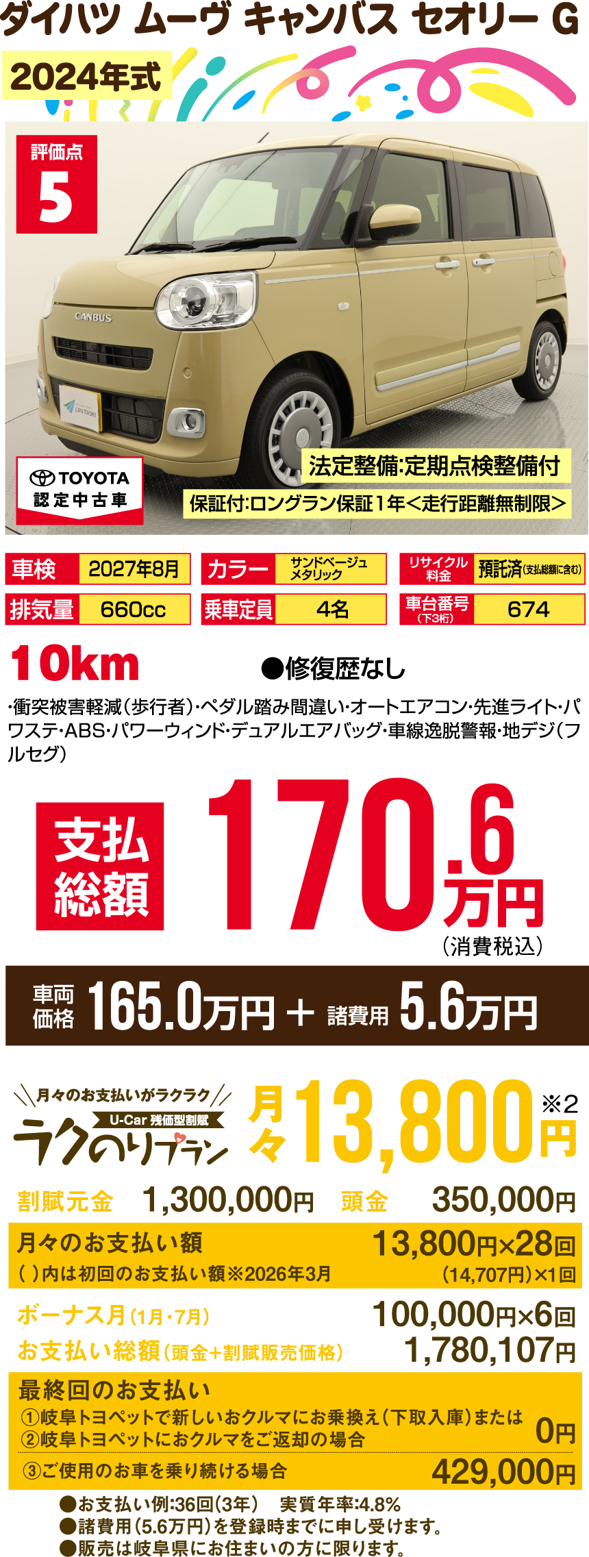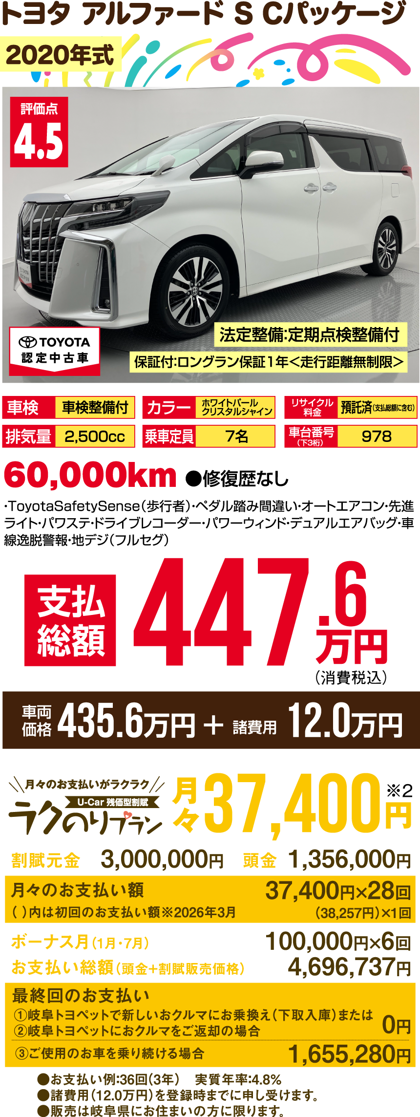 ※支払総額には、車両価格の他、保険料、税金、登録などに伴う費用など、購入の際に必要な全ての費用が含まれております。※「車検整備付」の場合、車検の有効期限が切れているため、納車時までに、乗用車は24ヵ月、商用車などは12ヵ月定期点検整備を実施し、車検を取得して納車します(費用は支払総額に含む)。※支払総額は、展示店にて2月登録の場合の価格です。お客様の要望に基づくオプション等の費用は別途申し受けます。※消費税10%込みとなります。※支払総額は、個人による購入で、下取車なし、店頭納車、販売店の所在する所轄運輸支局で登録する場合を前提としております。※車検切れ車両の場合、車検を取得するために必要な費用は、支払総額に含まれております。※ETCのセットアップ費用は別途申し受けます。※ウェルキャブ車(福祉車両)については、装置の種類や購入者の障害者手帳の有無、お住まいの都道府県の税制度により、税金の減免が異なる場合があります。◎3ケタの数字000…車台番号下3ケタを表示しています。※車両の正確な装備・価格は店頭の現車にてご確認ください。※慎重に作成しておりますが、万が一掲載ミスがあった場合はご容赦ください。※詳しい情報は、販売店へ直接お問合せください。掲載の車両は2026年1月7日時点の情報です。売約済みの際はご容赦ください。●販売は岐阜県にお住まいの方に限ります。