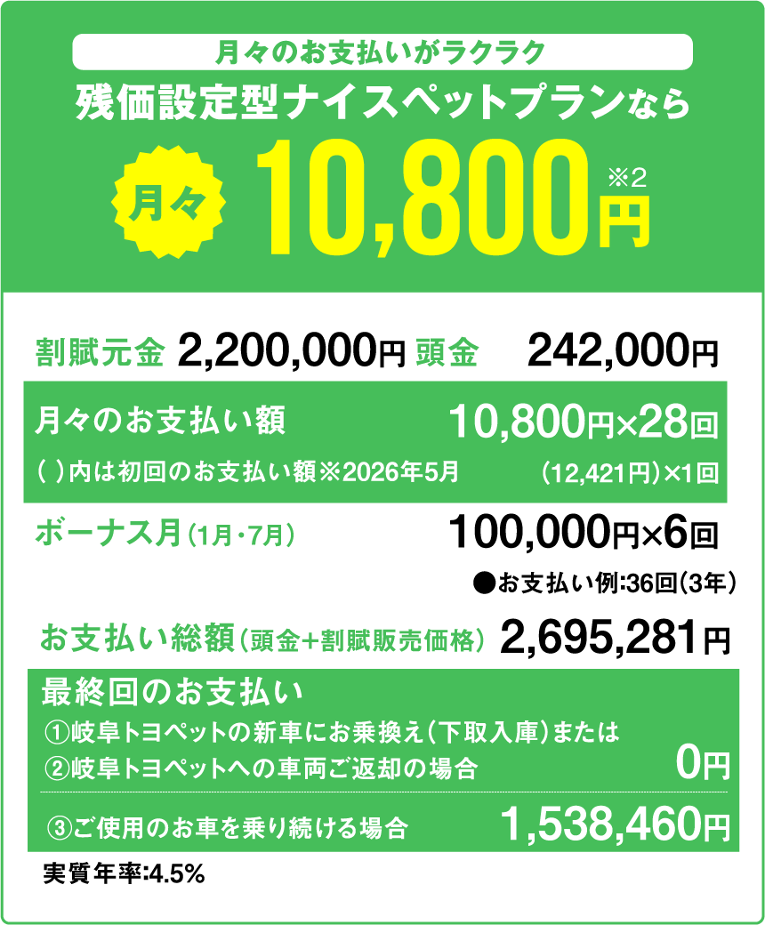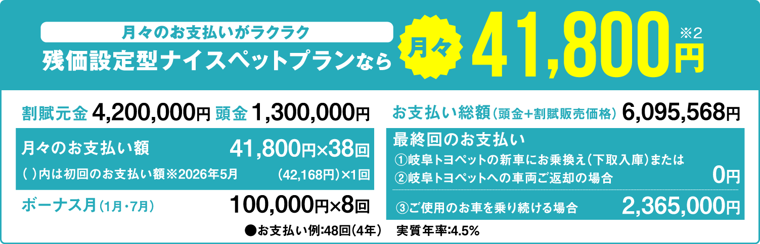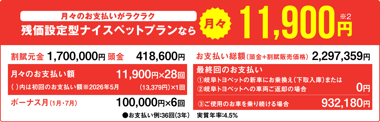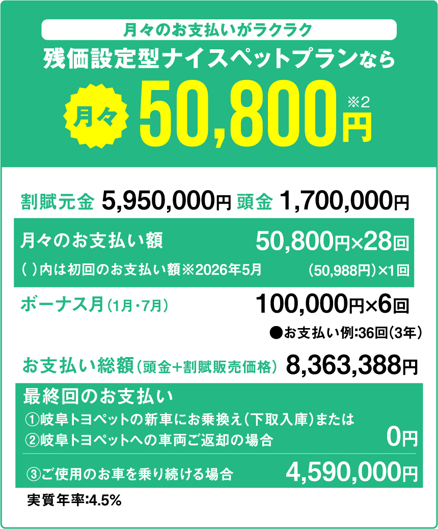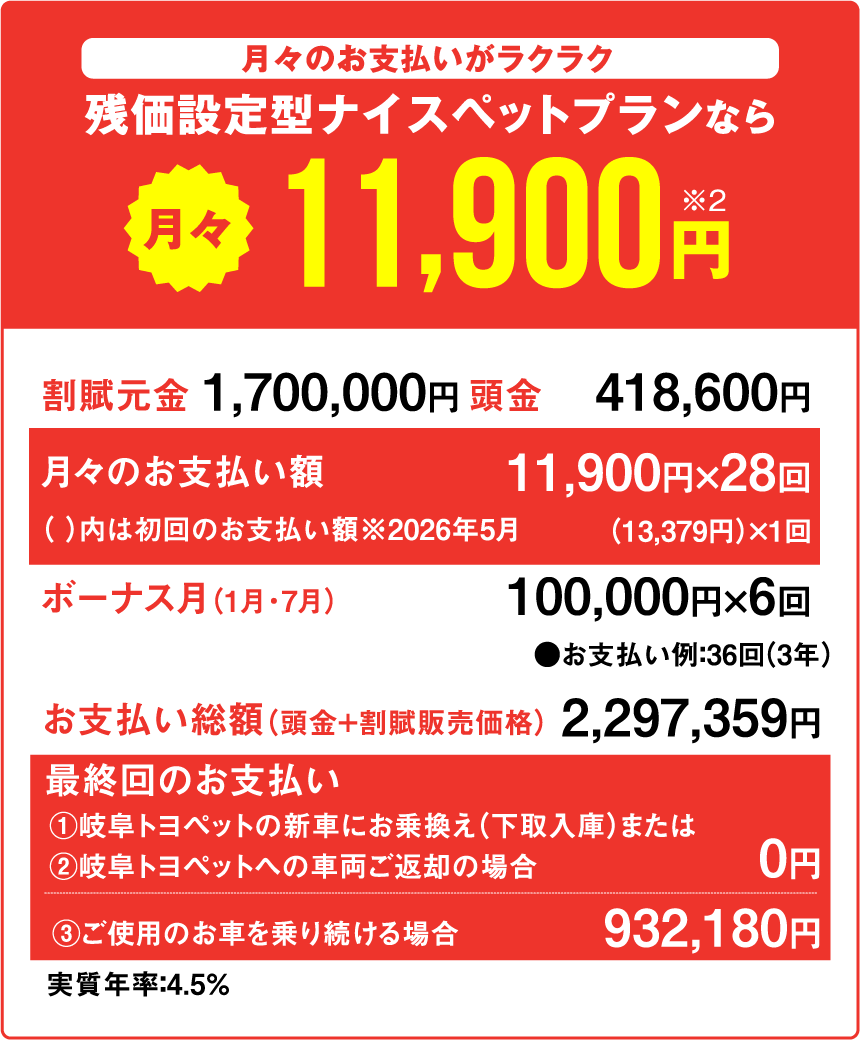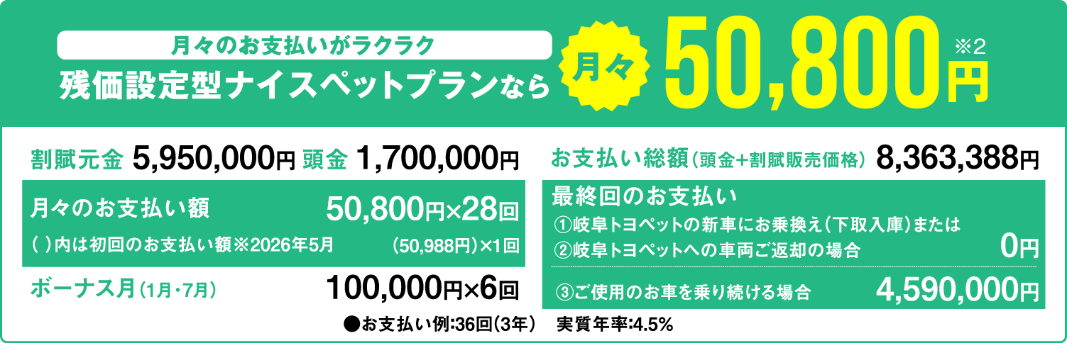 ※2.上記はあくまでも計算例であり、実際の契約内容によっては異なることがあります。保険料、税金(消費税を除く)、登録等に伴う諸費用は別途申し受けます。リサイクル料金が別途必要となります。実際の納期、支払日とは異なります。詳しくはスタッフにお尋ねください。
