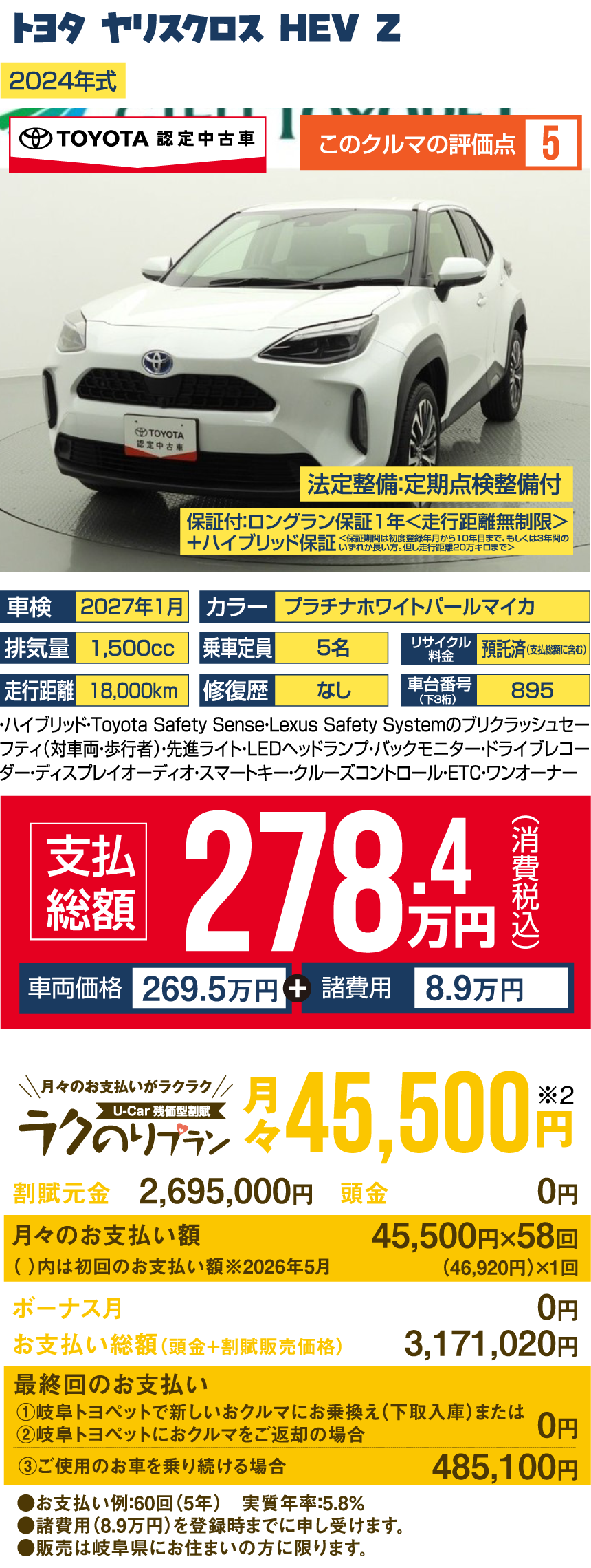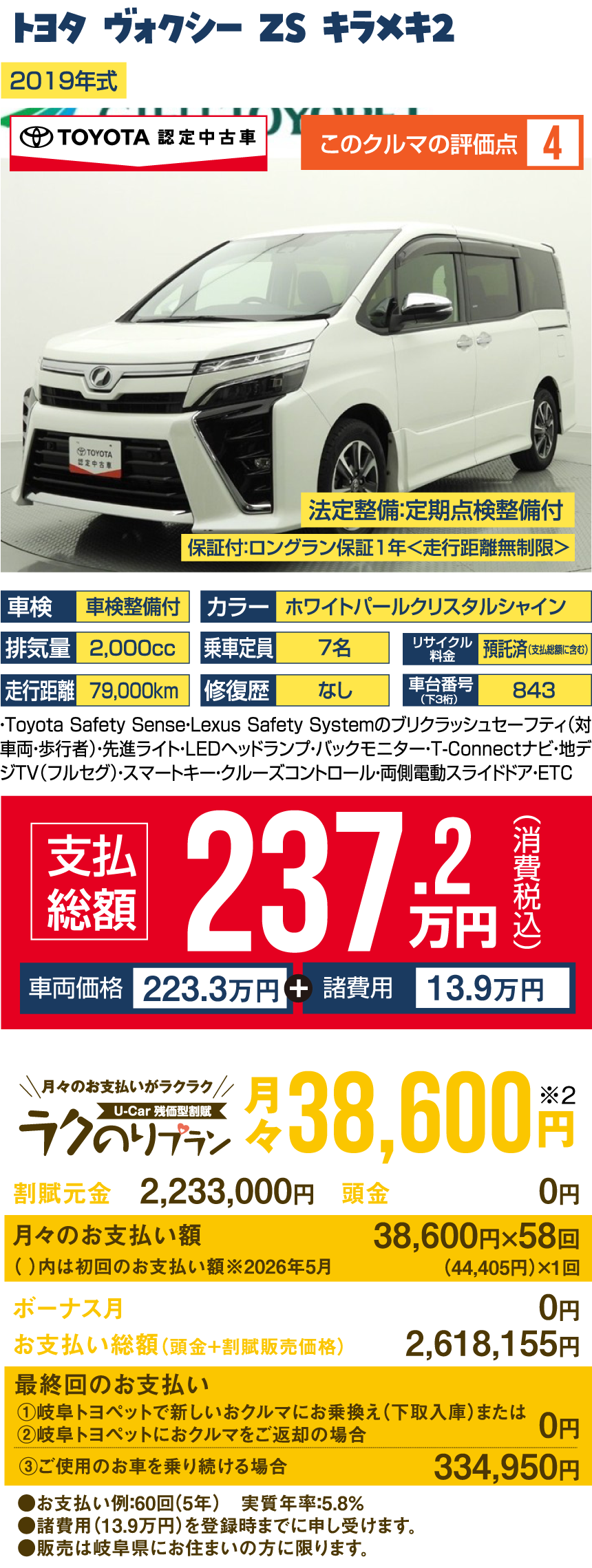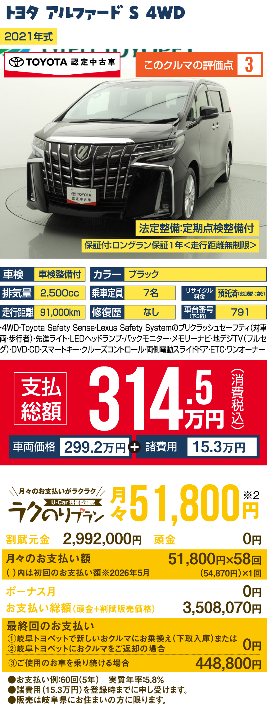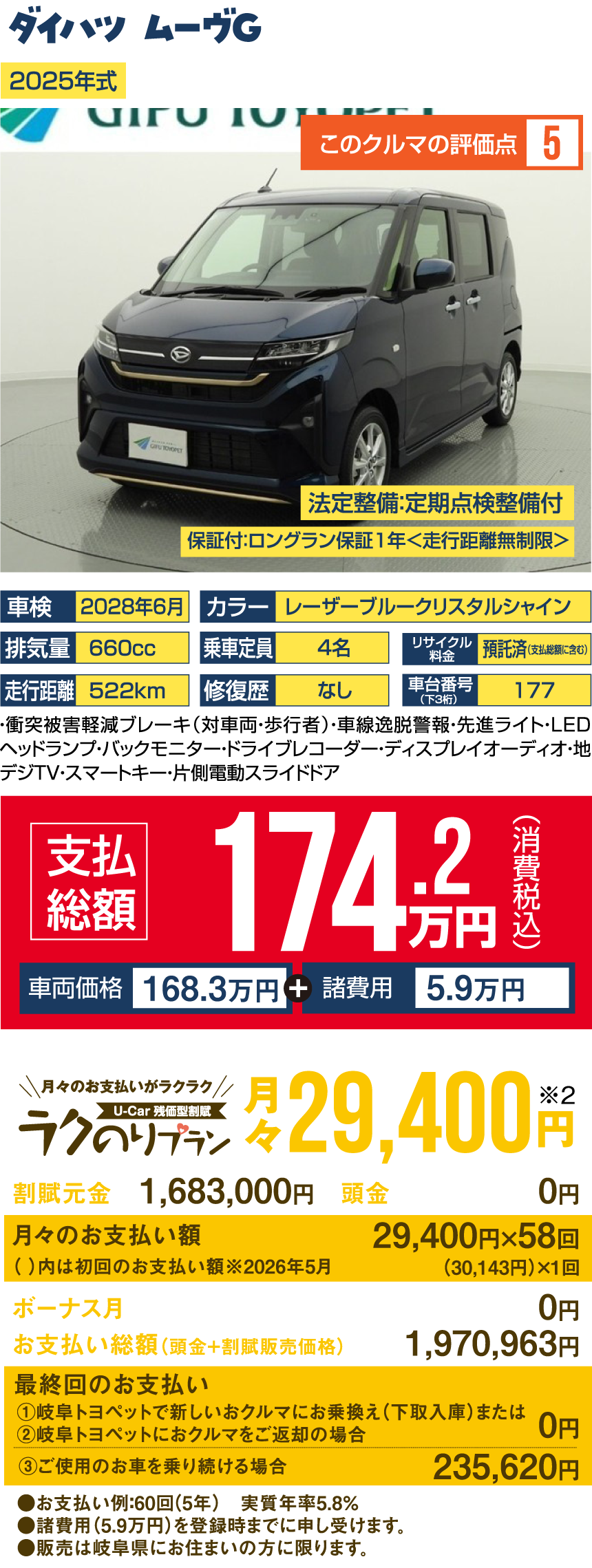 ※支払総額には、車両価格の他、保険料、税金、登録などに伴う費用など、購入の際に必要な全ての費用が含まれております。※「車検整備付」の場合、車検の有効期限が切れているため、納車時までに、乗用車は24ヵ月、商用車などは12ヵ月定期点検整備を実施し、車検を取得して納車します(費用は支払総額に含む)。※支払総額は、展示店にて5月登録の場合の価格です。お客様の要望に基づくオプション等の費用は別途申し受けます。※消費税10%込みとなります。※支払総額は、個人による購入で、下取車なし、店頭納車、販売店の所在する所轄運輸支局で登録する場合を前提としております。※車検切れ車両の場合、車検を取得するために必要な費用は、支払総額に含まれております。※ETCのセットアップ費用は別途申し受けます。※ウェルキャブ車(福祉車両)については、装置の種類や購入者の障害者手帳の有無、お住まいの都道府県の税制度により、税金の減免が異なる場合があります。◎3ケタの数字000…車台番号下3ケタを表示しています。※車両の正確な装備・価格は店頭の現車にてご確認ください。※慎重に作成しておりますが、万が一掲載ミスがあった場合はご容赦ください。※詳しい情報は、販売店へ直接お問合せください。掲載の車両は2026年4月22日時点の情報です。売約済みの際はご容赦ください。●販売は岐阜県にお住まいの方に限ります。