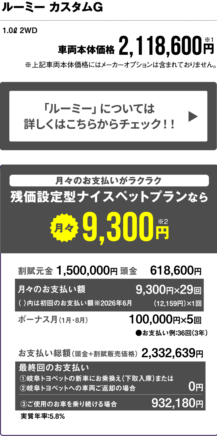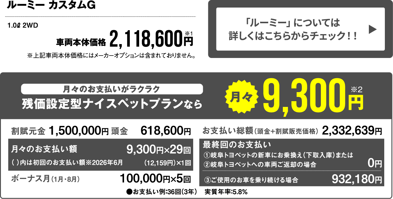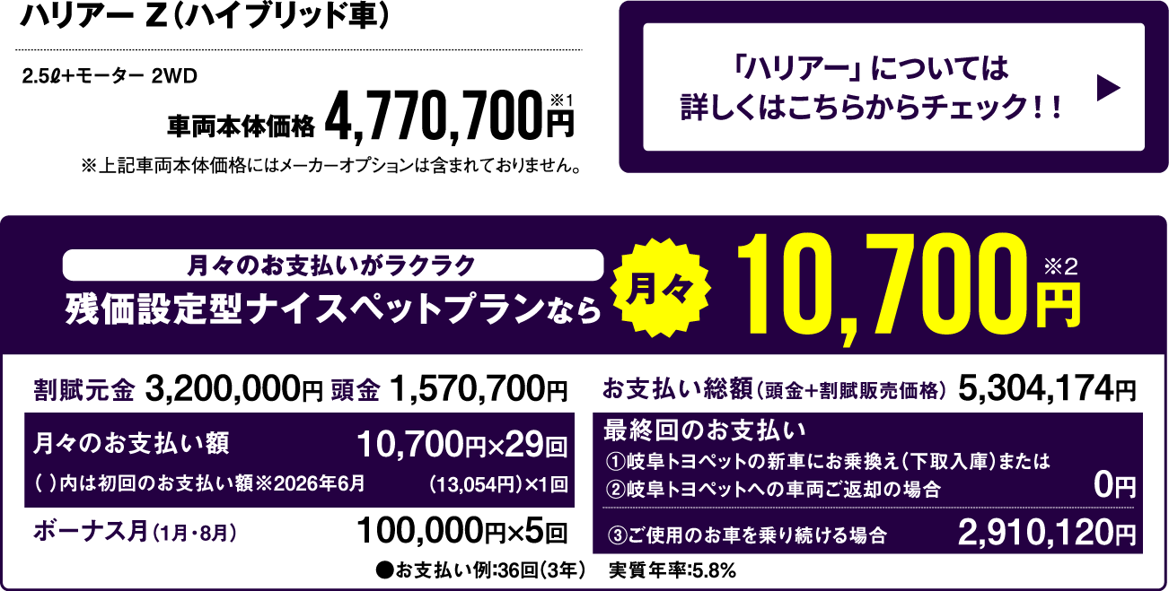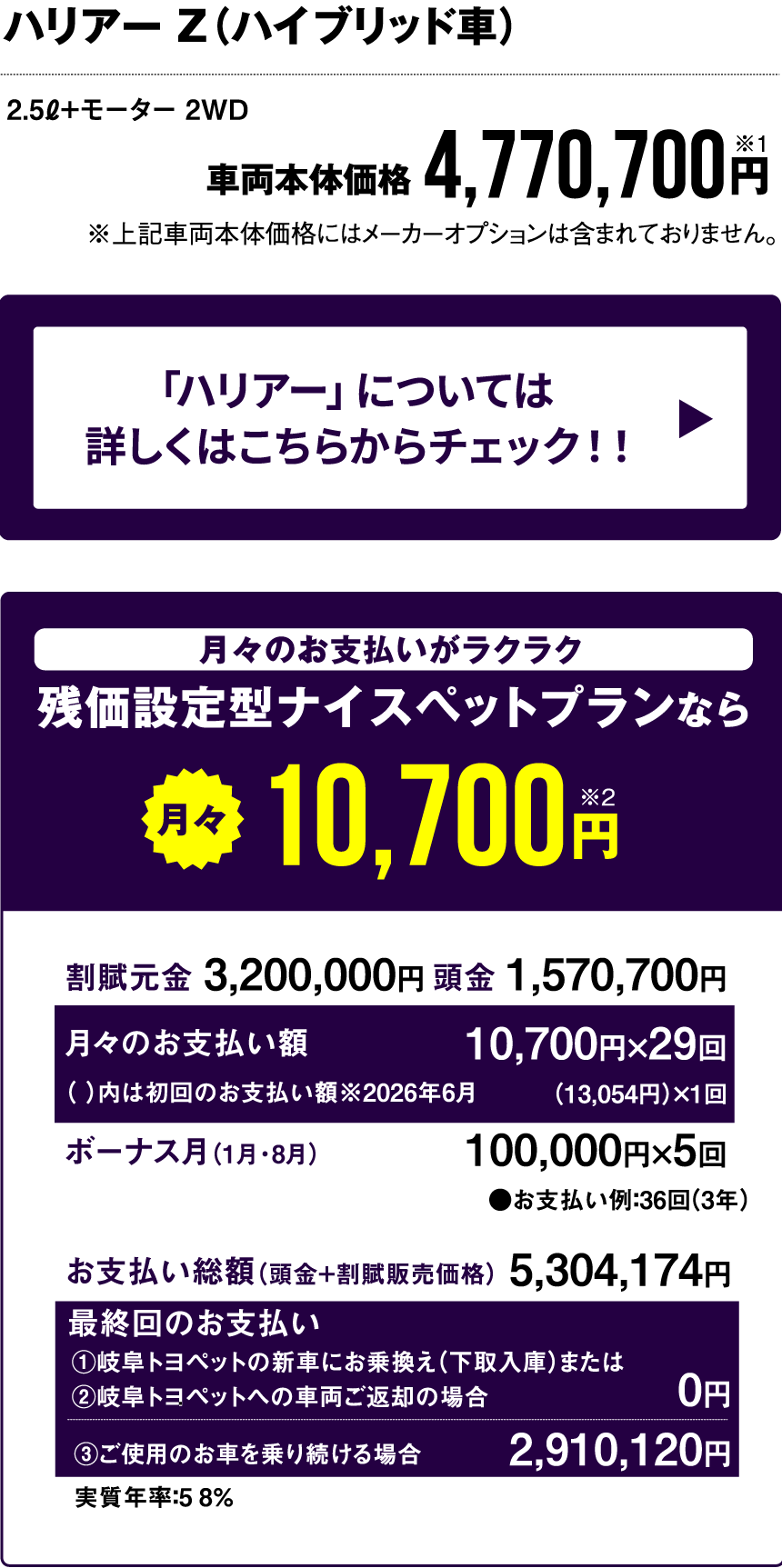 ※2.上記はあくまでも計算例であり、実際の契約内容によっては異なることがあります。保険料、税金(消費税を除く)、登録等に伴う諸費用は別途申し受けます。リサイクル料金が別途必要となります。実際の納期、支払日とは異なります。詳しくはスタッフにお尋ねください。